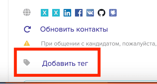 Оставляйте теги в краткой карточке (под иконками социальных профилей с инфо о кандидате и кнопкой добавления в папку)