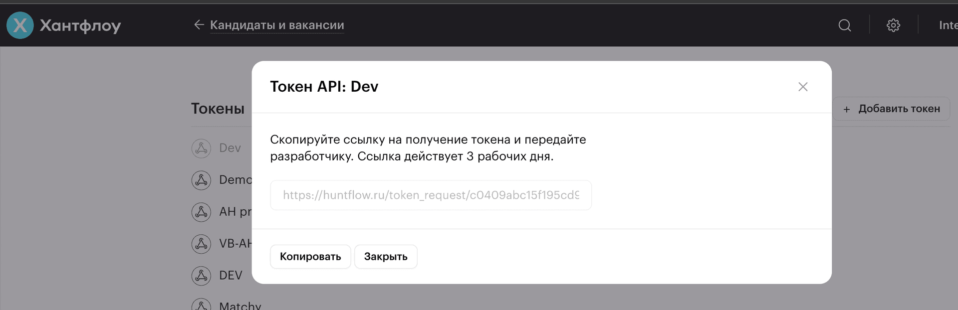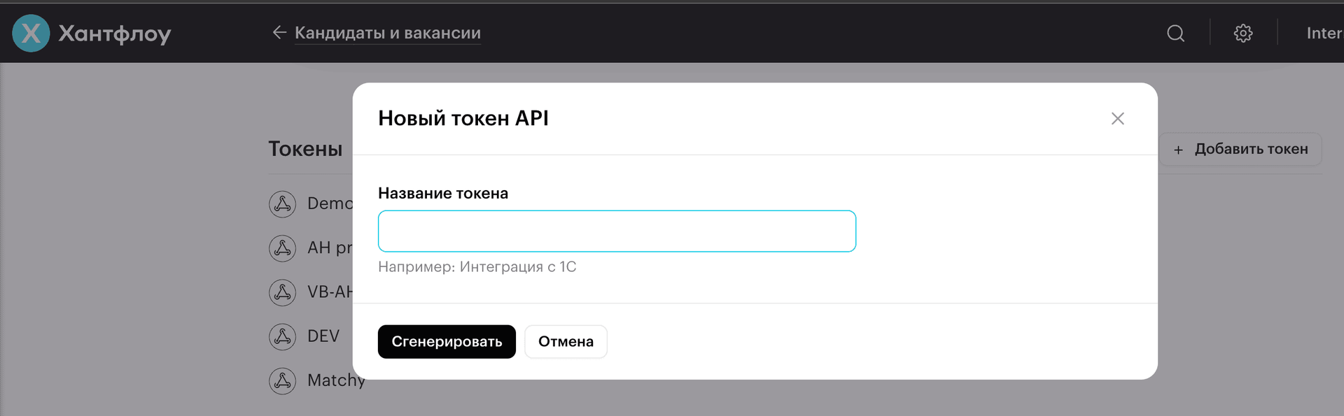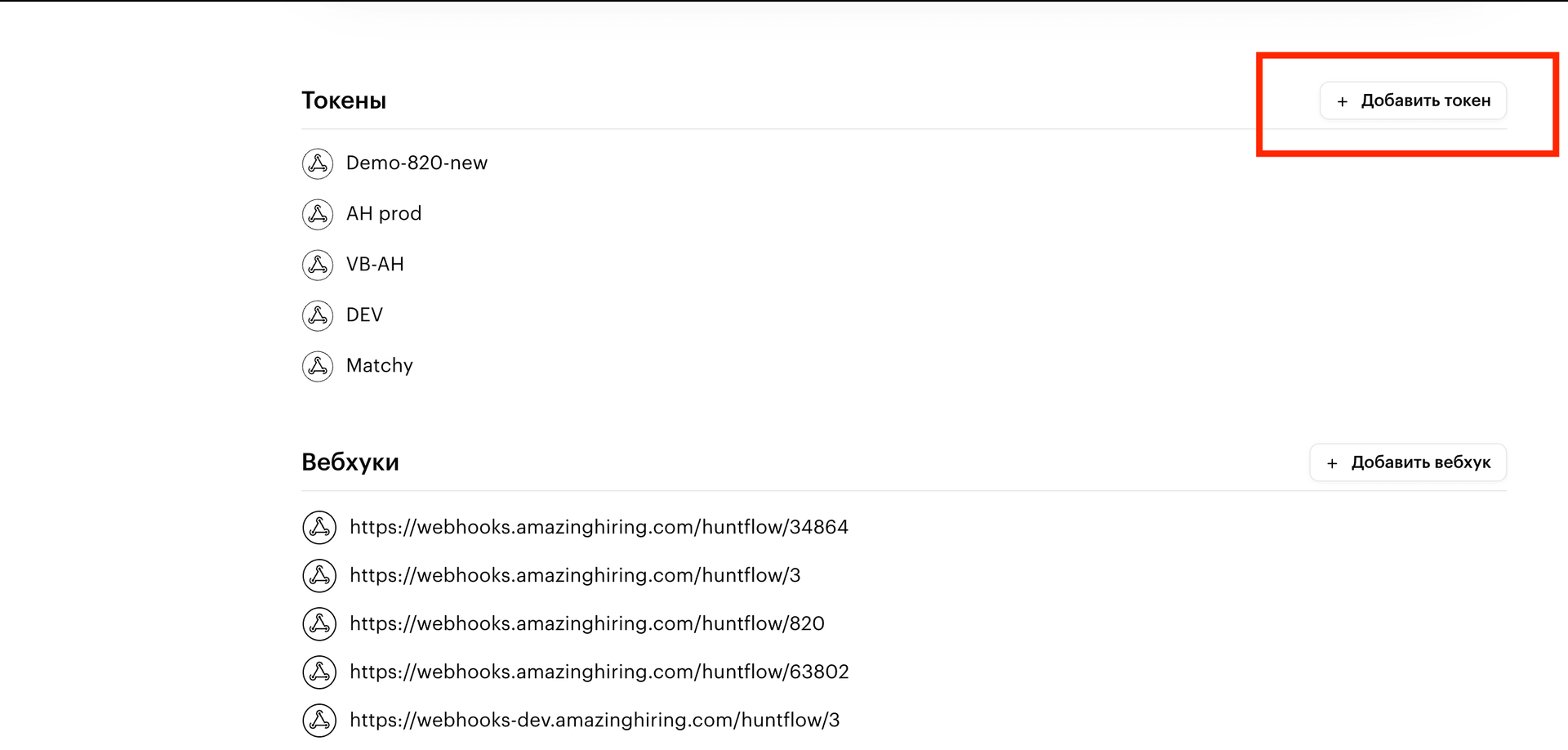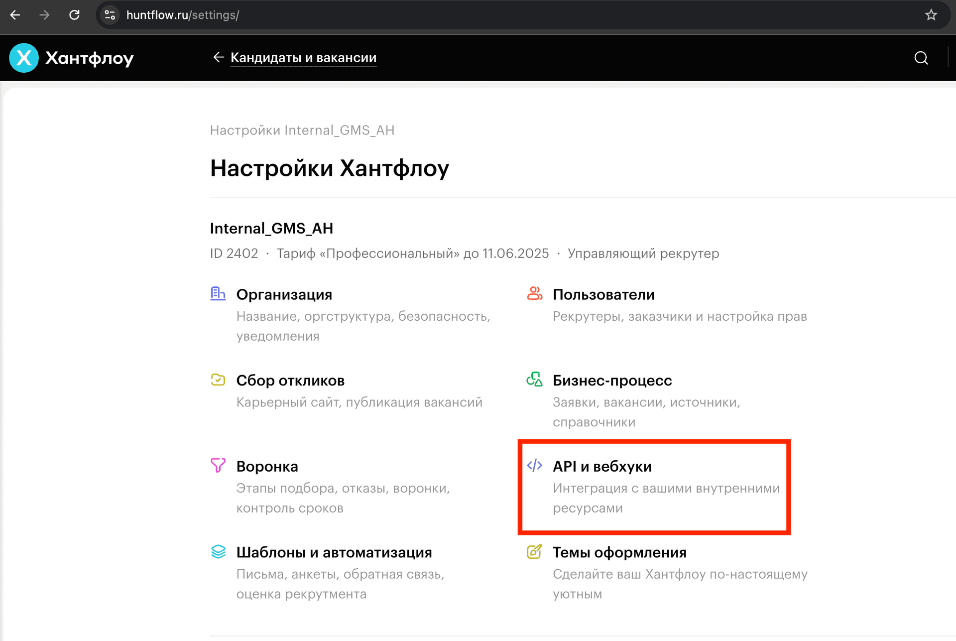 Для подключения вам необходимосгенерировать ссылку в аккаунте администратора Хантфлоу. Для этого перейдите в Настройки (справа вверху нужно кликнуть на наименование Вашей компании и выбрать "Настройки Хантфлоу" из выпадающего списка) и выберите подраздел API и вебхуки :