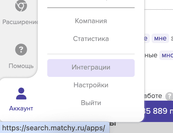 Далее перейдите в раздел интеграций Мэтчи (в левом нижнем углу, в меню раздела Аккаунт):