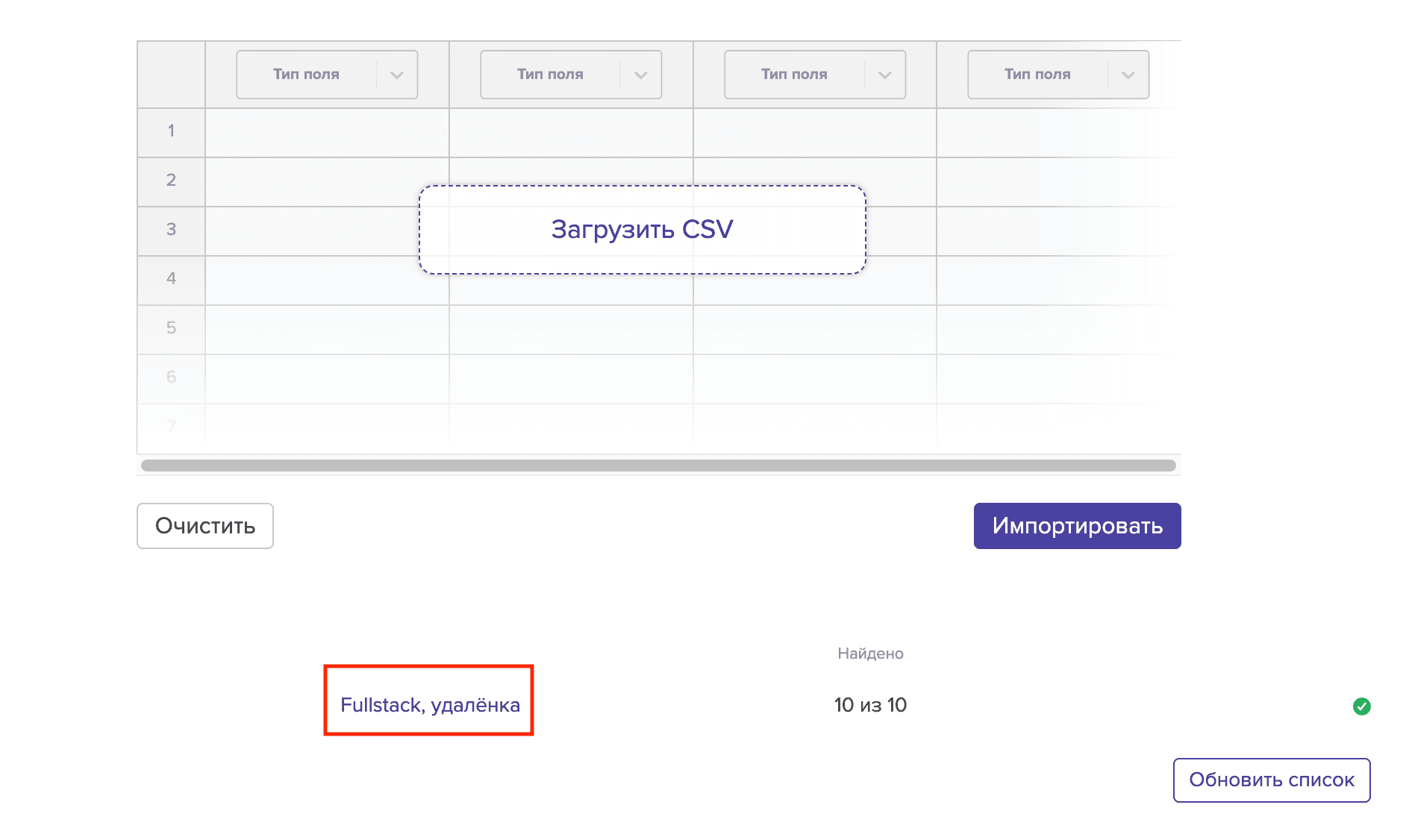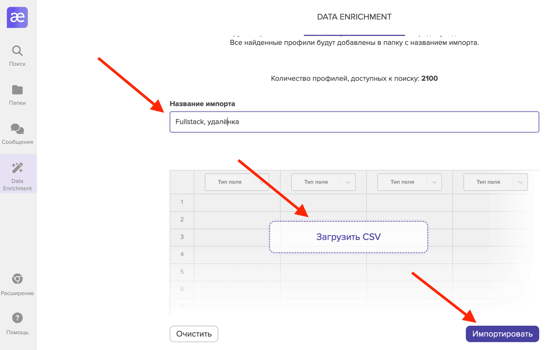 Для импорта профилей перейдите в Data Enrichement -> далее введите название для импорта -> далее загрузите CSV файл -> далее выберите какую информацию вы хотите загрузить: ссылки/email/телефон/tg (ссылки или email чаще всего встречаются в профилях кандидатов, поэтому могут быть более эффективными) -> нажмите "Импортировать ":