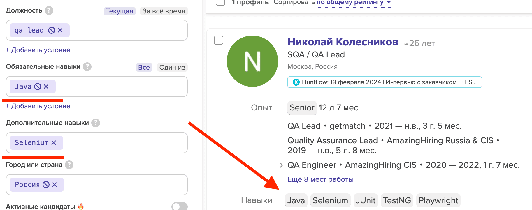 Используя поисковые подсказки, вы всегда можете увидеть список ресурсов, в которых система обнаружила критерии, указанные вами в поисковом запросе. Ключевые слова, набранные вами в фильтрах по Обязательным и Дополнительным навыкам будут подчеркнуты в краткой карточке кандидата пунктирной линией.