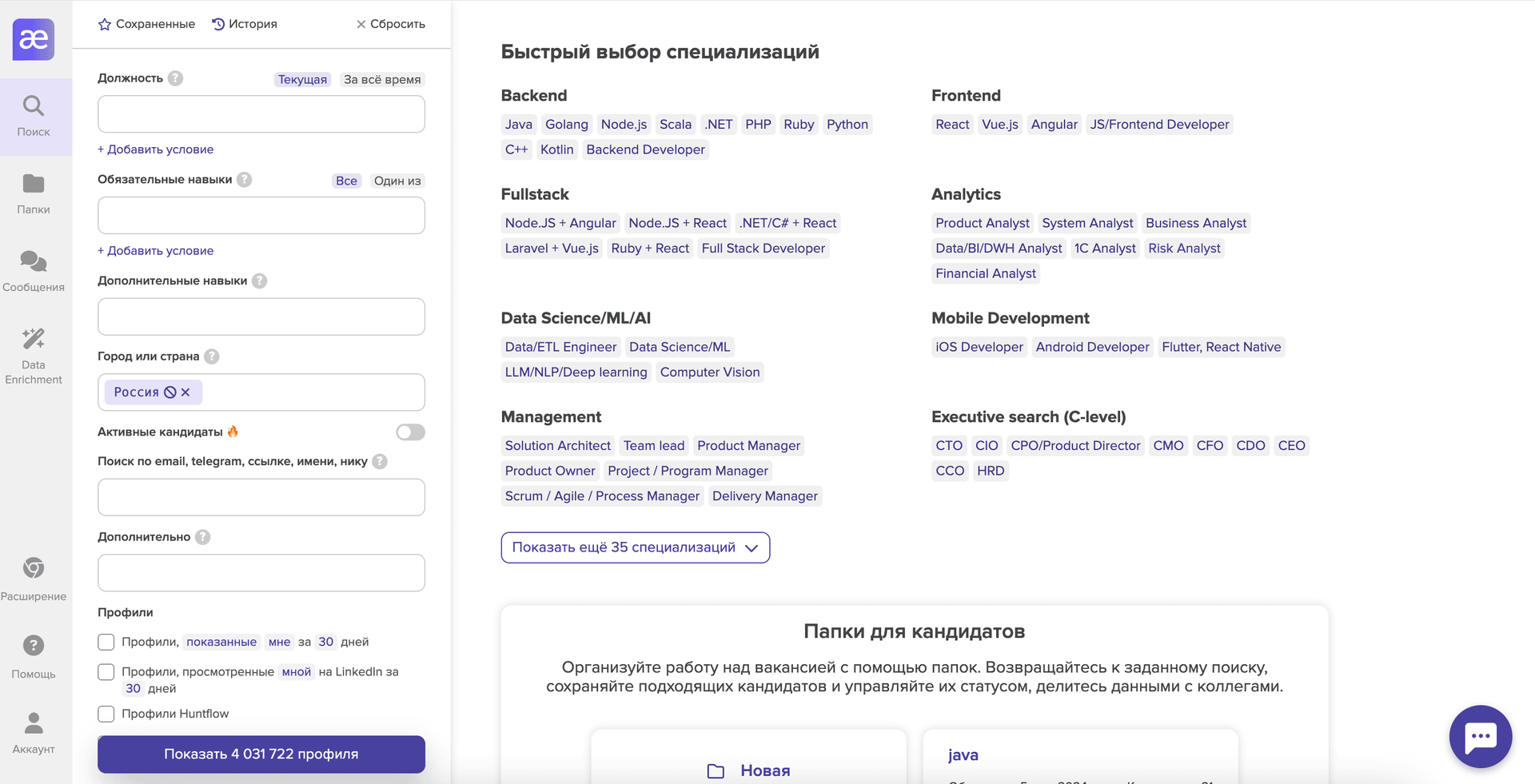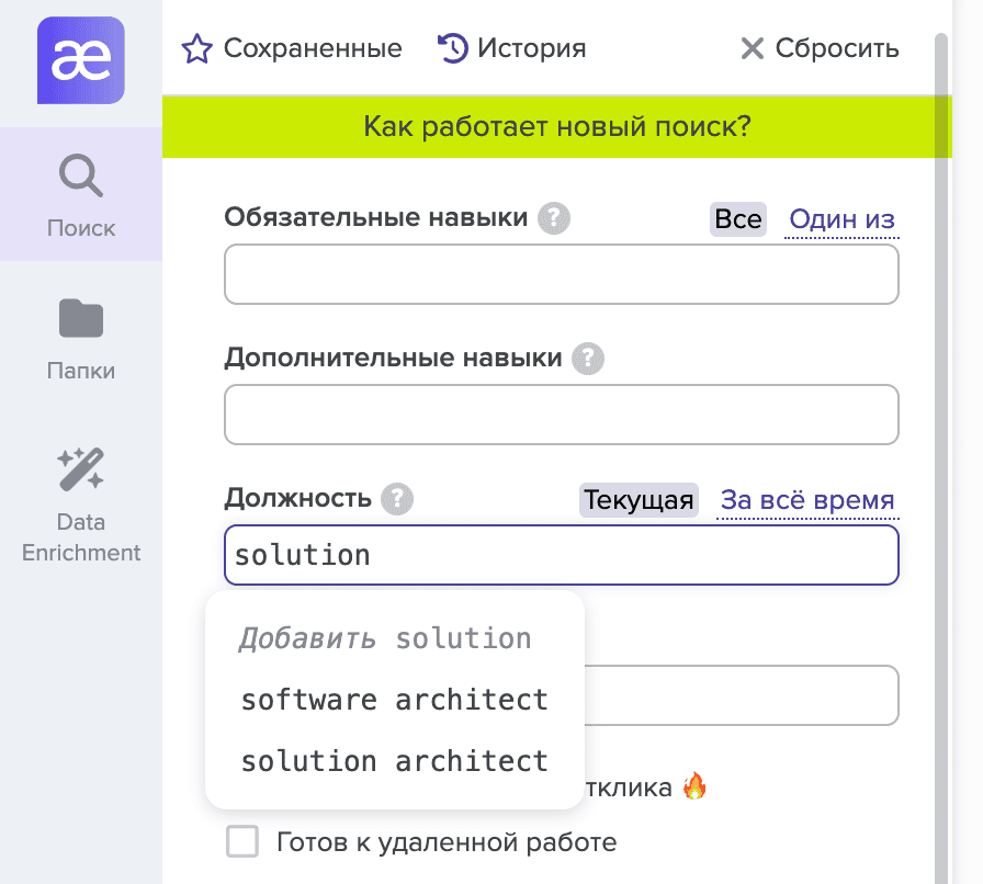 Мы объединили основные условия поиска и фильтры в одну форму, так что вы можете начать поиск, ввести необходимые требования, настроить фильтры и продолжить работу со своим пулом не переходя на новые страницы!