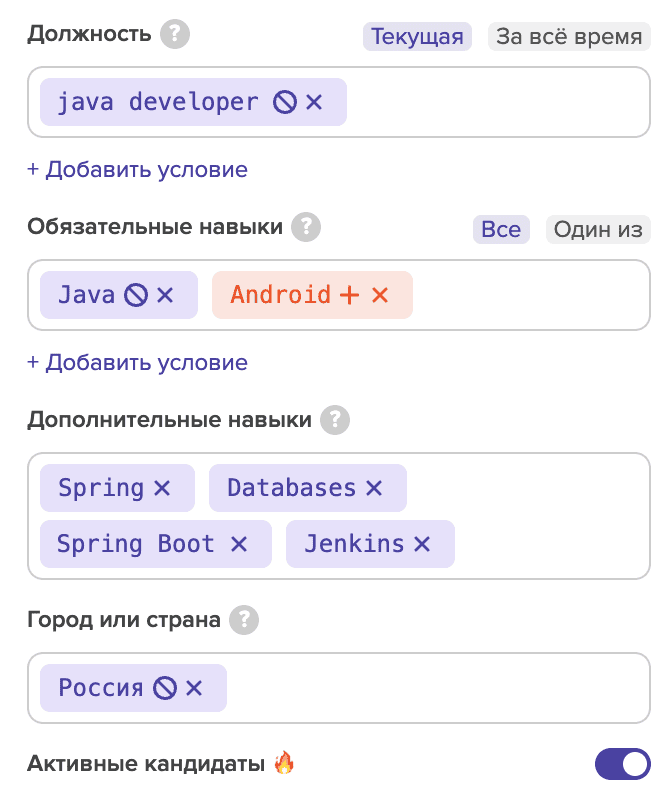 Если вы строите поиск по широкому списку навыков, вы можете использовать опцию "Один из". Тогда поиск будет строиться по одному из выбранных навыков. А если нужны все из перечисленных навыков - можно переключить на "Все ".