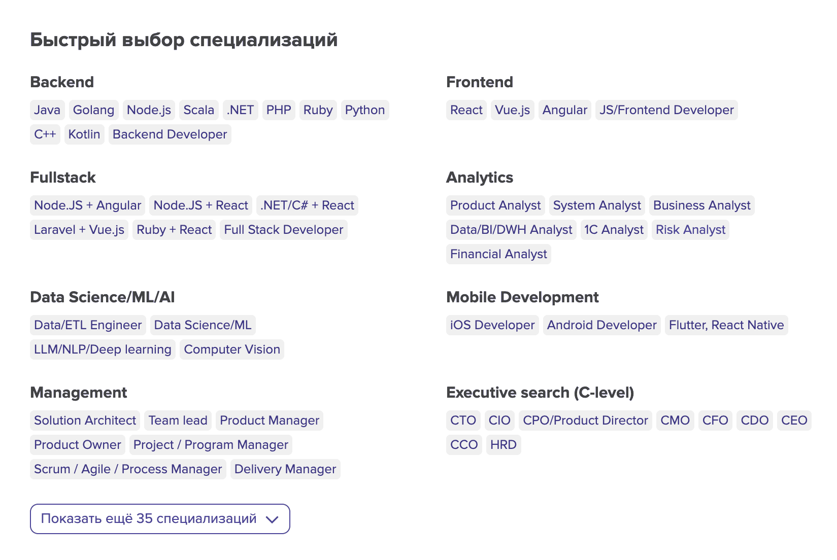 Другой стратегий поиска может стать "Быстрый выбор специализаций". Вы можете выбрать нужную вам специализацию из нашей Библиотеки и создать быстрый поиск в один клик: