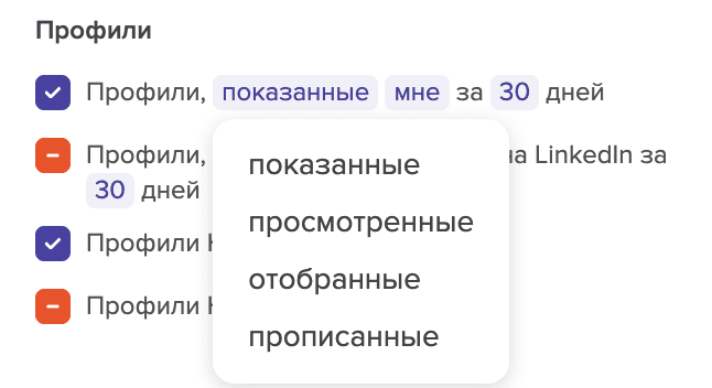 Здесь вы также можете включить или исключить профили , которые были просмотрены вами или вашей командой в LinkedIn в течение определённого периода времени - от 1 до 30 дней.