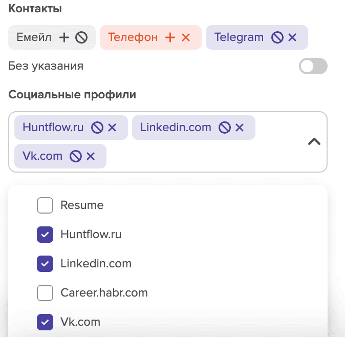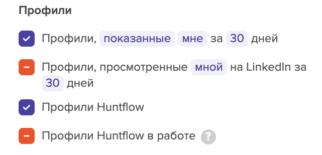 - Также в этом разделе вы можете включить или исключать профили из Хантфлоу и профили "в работе" в Хантфлоу. Здесь вы можете ознакомиться более детально с интеграцией с Хантфлоу.