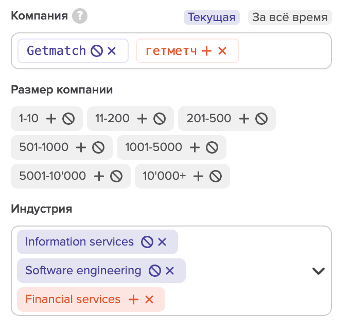 Далее вы можете включать или исключать компании или ранжировать кандидатов по размеру их текущей компании, а также выбирать или исключать индустрию текущего места работы: