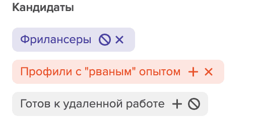 Также,с помощью гибких фильтров вы можете включать или исключать Фрилансеров, профили с "Рваным опытом ", а также кандидатов с**"Готовностью к удаленной работе"** в один клик.