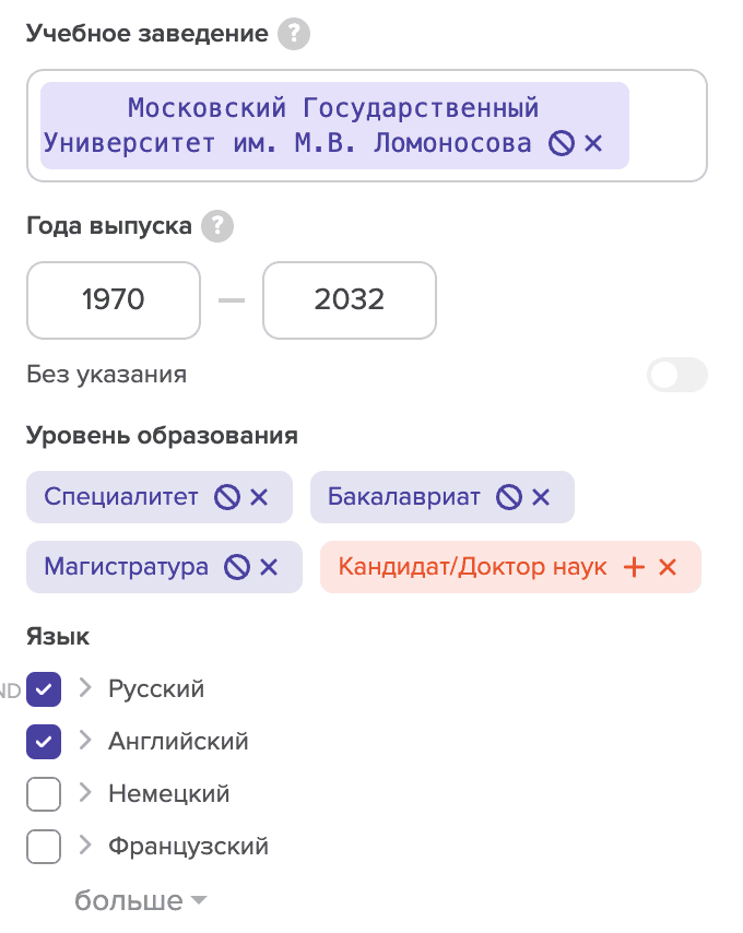 У вас есть возможность отфильтровать кандидатов по конкретным университетам или уровням образования. Ещё мы проработали языковой фильтр и добавили возможность поиска по определённому уровню языка: