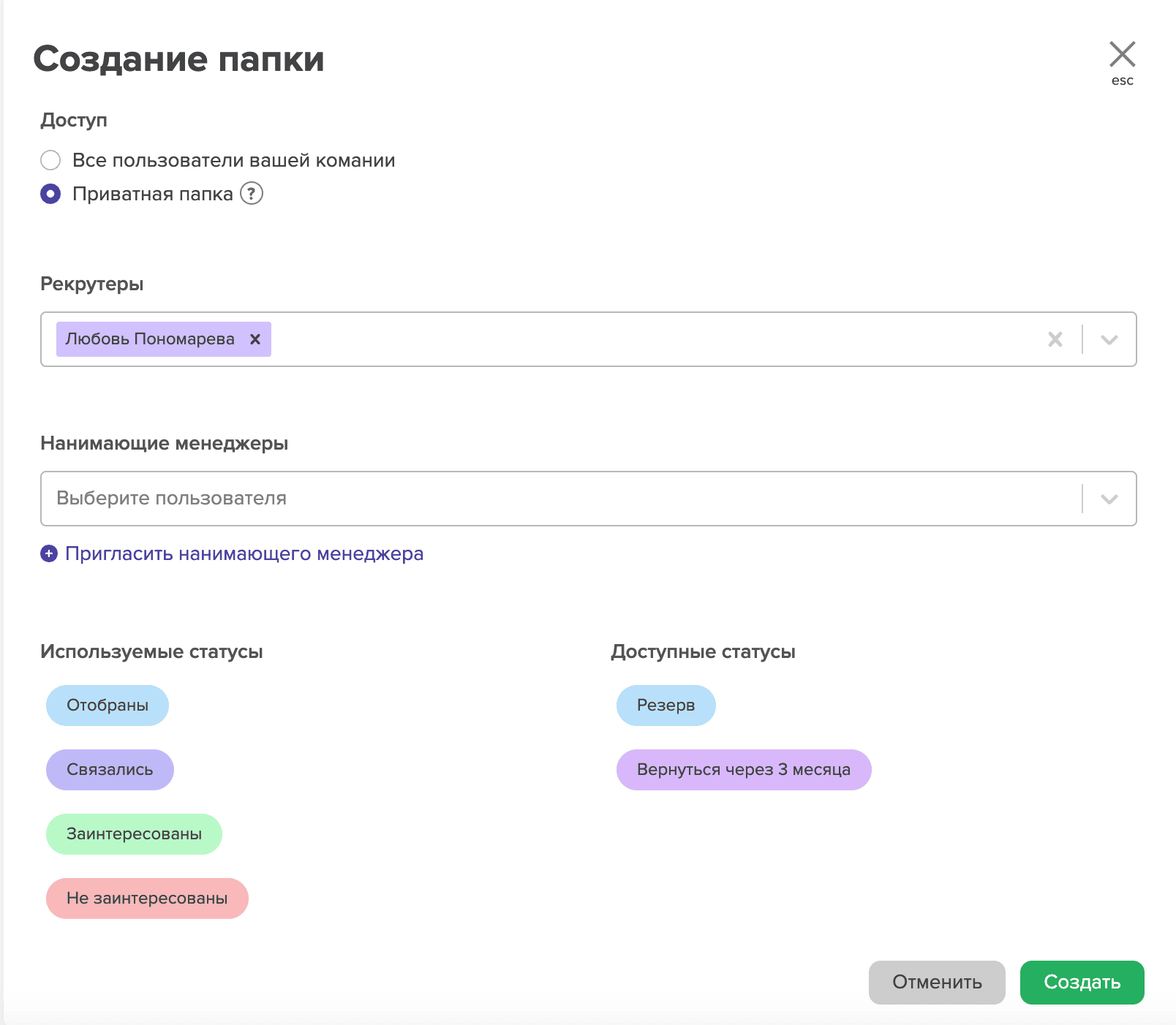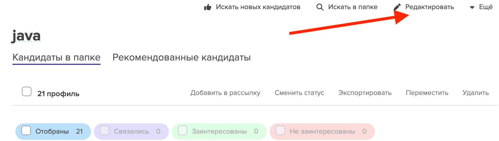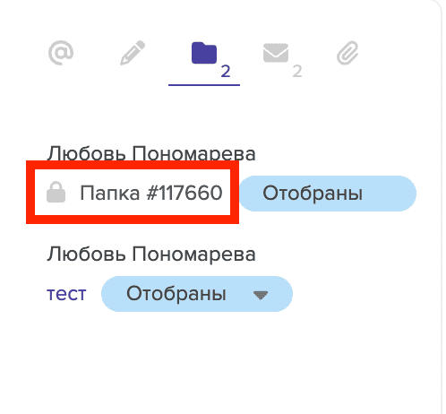 Соответственно, ваши коллеги видят, что кандидат отобран в одну из ваших папок или получил одну из ваших рассылок, но не увидят деталей (названия папки/рассылки) и не смогут перейти в нее.