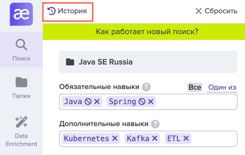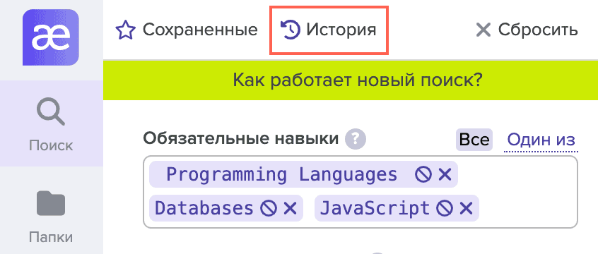 Вы всегда можете вернуться ко всем своим предыдущим поисковым запросам, просто нажав на кнопку "История ", расположенную в верхней части поисковой формы: