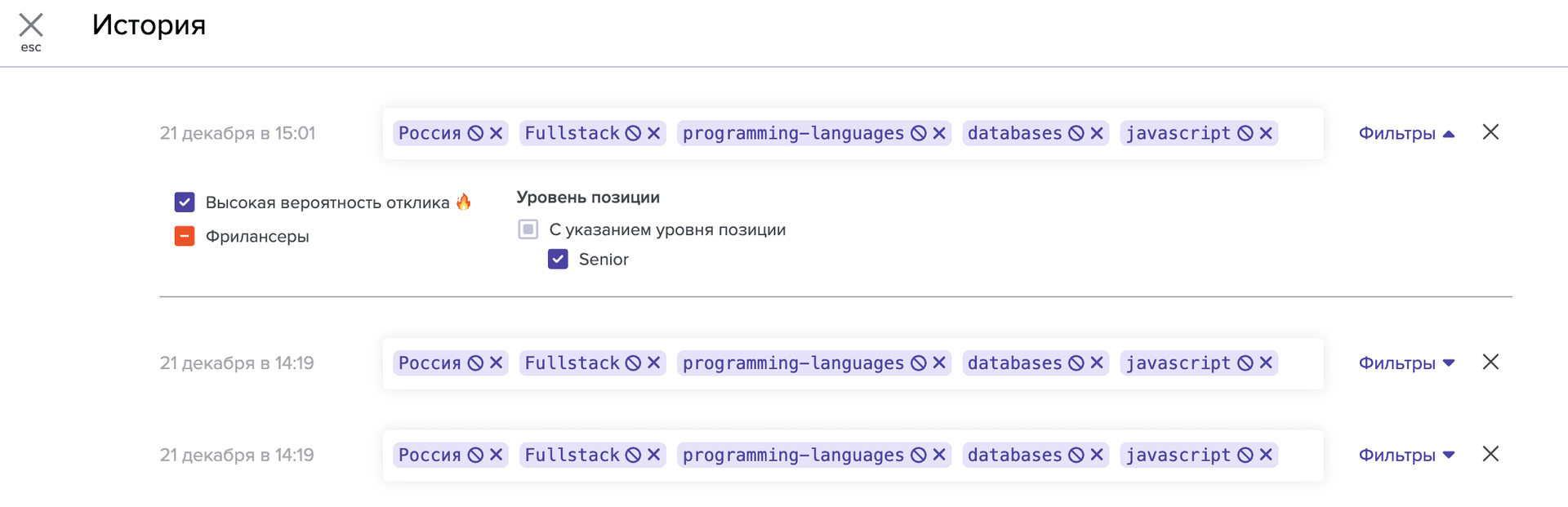 Далее вы сможете увидеть свои последние поиски, включая фильтры, которые вы использовали, и перейти к любому из них, нажав на запрос: