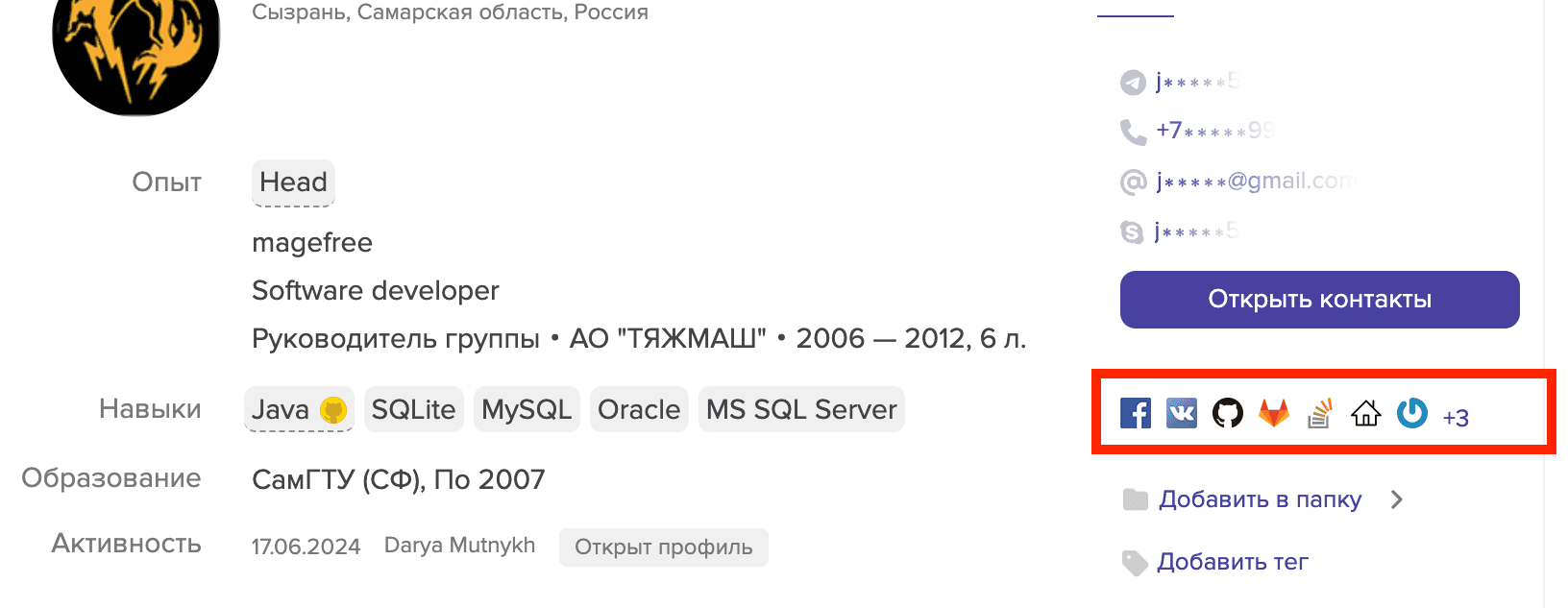 Для того чтобы перейти в аккаунт кандидата в какой-либо социальной сети или сайте, нажмите на иконку данного ресурса в краткой карточке кандидата, которую вы видите в поисковой выдаче, или в полном профиле того же кандидата.
