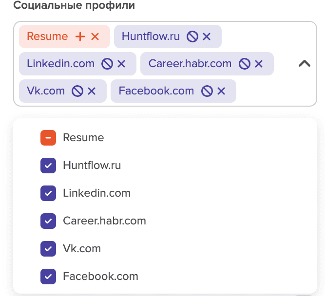 Вы также можете отфильтровать кандидатов по определённым профилям с помощью Раздела**"Доступные контакты"** и фильтра Социальные профили, выбрав или исключив нужные: