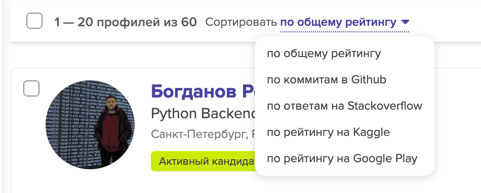 И также ранжировать кандидатов в выдаче по их рейтингу в профессиональных ресурсах: