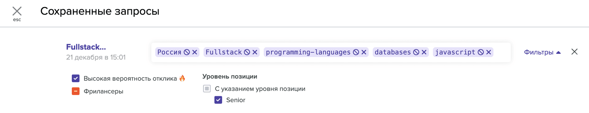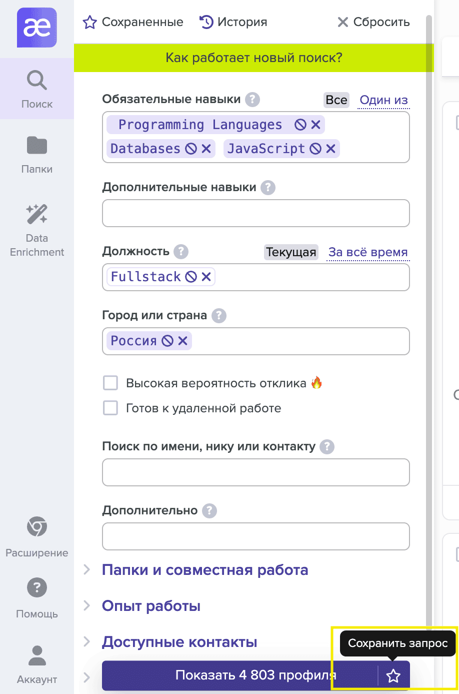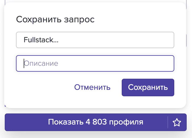Вы можете сохранять поисковые запросы в системе и возвращаться к ним в любое время. При этом сохраняется не только сам запрос, но и все фильтры, которые вы использовали.