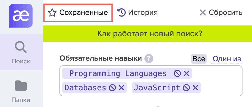 Чтобы вернуться к сохранённому запросу, перейдите в раздел “Сохранённые” в левом верхнем углу поисковой формы: