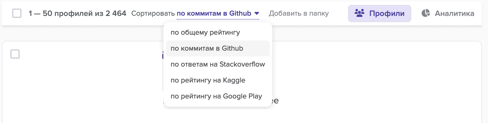 Используя данные сортировки, вы можете увидеть в верхней части поисковой выдачи не только опытных разработчиков, работающих на лидеров рынка, но и начинающих разработчиков, которые активно проявляют себя на GitHub, StackOverflow, Kaggle и Google Play.
