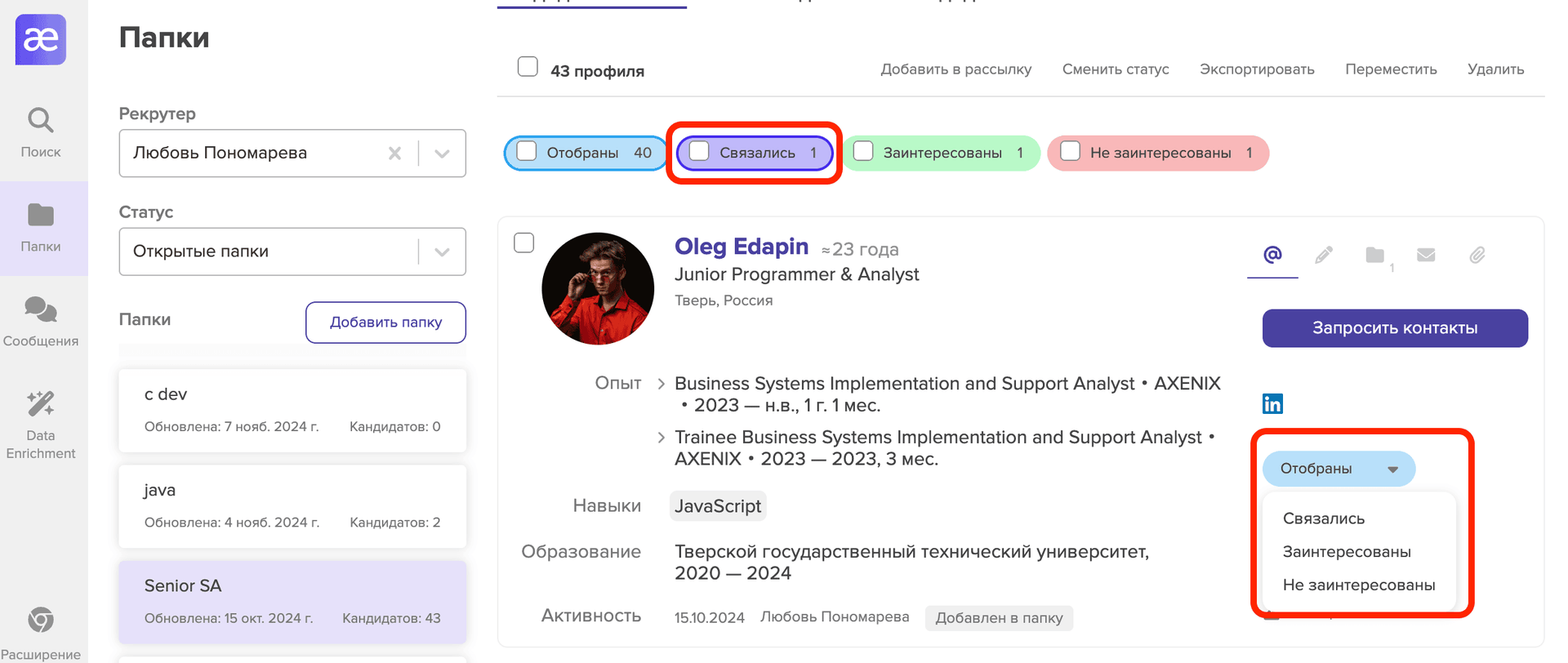 Внутри папки можно увидеть всех отобранных кандидатов и отслеживать, на какой стадии воронки находится кандидат. Чтобы обновить статус кандидата, кликните на раскрывающееся меню статусов и выберите новый. Для того что отфильтровать профили, находящиеся на определенной стадии коммуникации, нажмите на необходимый статус вверху папки.