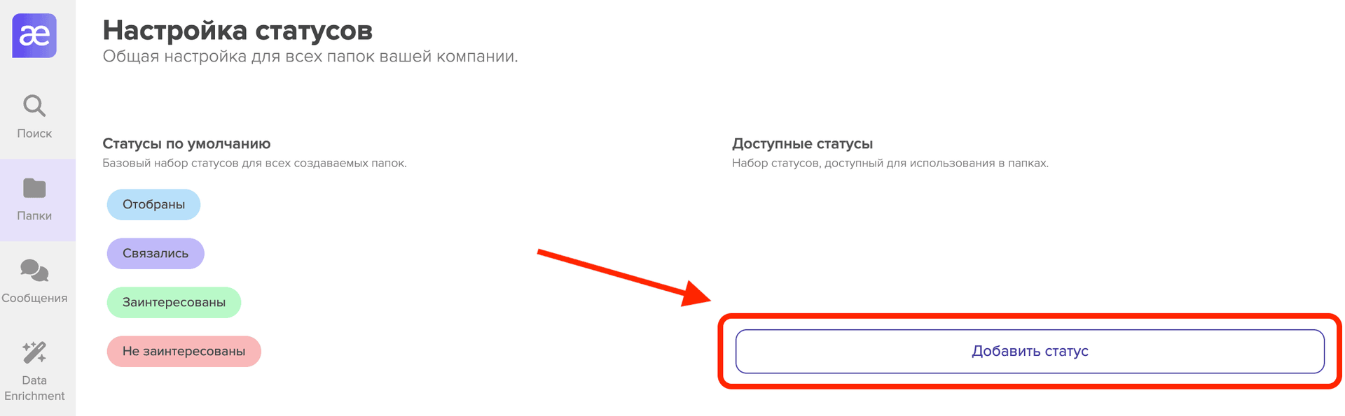По умолчанию вам доступны только несколько стандартных статусов. Если вы хотите использовать кастомизированные статусы, наведите курсор на раздел "Папки" в боковом меню и из выпадающего списка выберите "Настройка статусов"