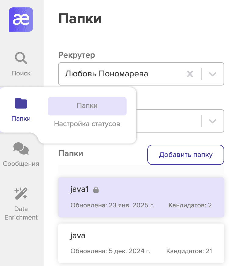 Если вы хотите связаться сразу с большим числом понравившихся кандидатов, запустите рассылку прямо из системы. Для этого откройте нужную папку из раздела Папки в боковом меню,