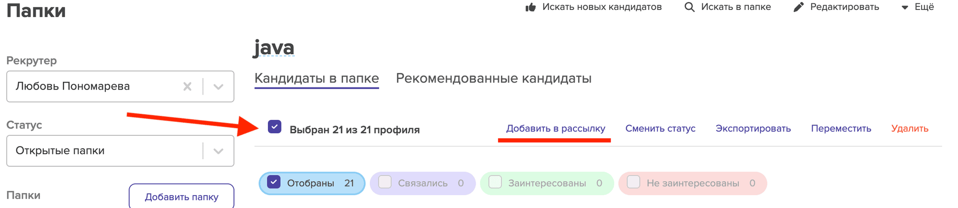 выберите кандидатов (конкретных из папки или всю папку целиком) и нажмите на кнопку "Добавить в рассылку".