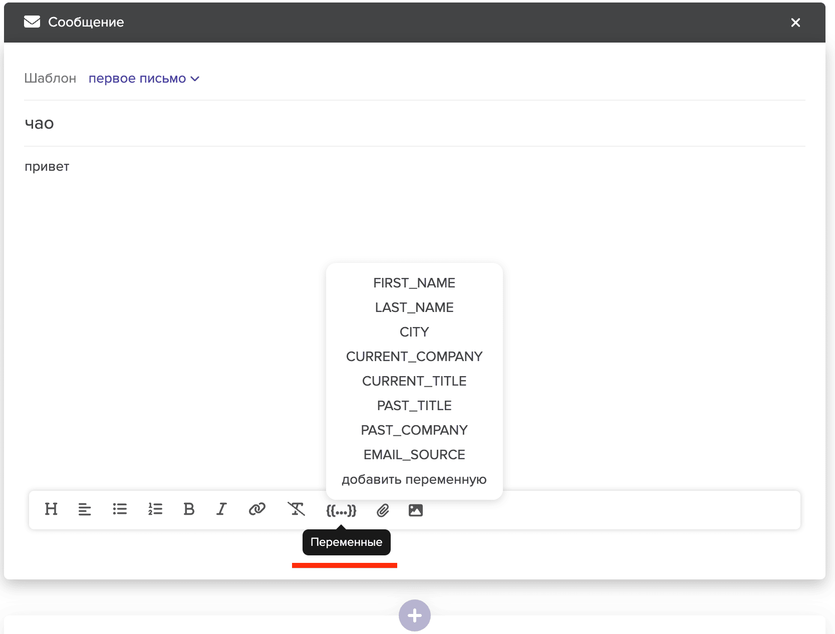 Далее выберите шаблон письма или напишите текст сами (Как создавать шаблоны писем?). Для персонализации вашей рассылки , используйтеспециальные переменные. Просто выберите место в сообщении, которое вы хотите персонализировать, и добавьте соответствующую переменную. Для этого нажмите на кнопку "Переменные" , выберите из существующих или создайте уникальную через кнопку "Добавить переменную".