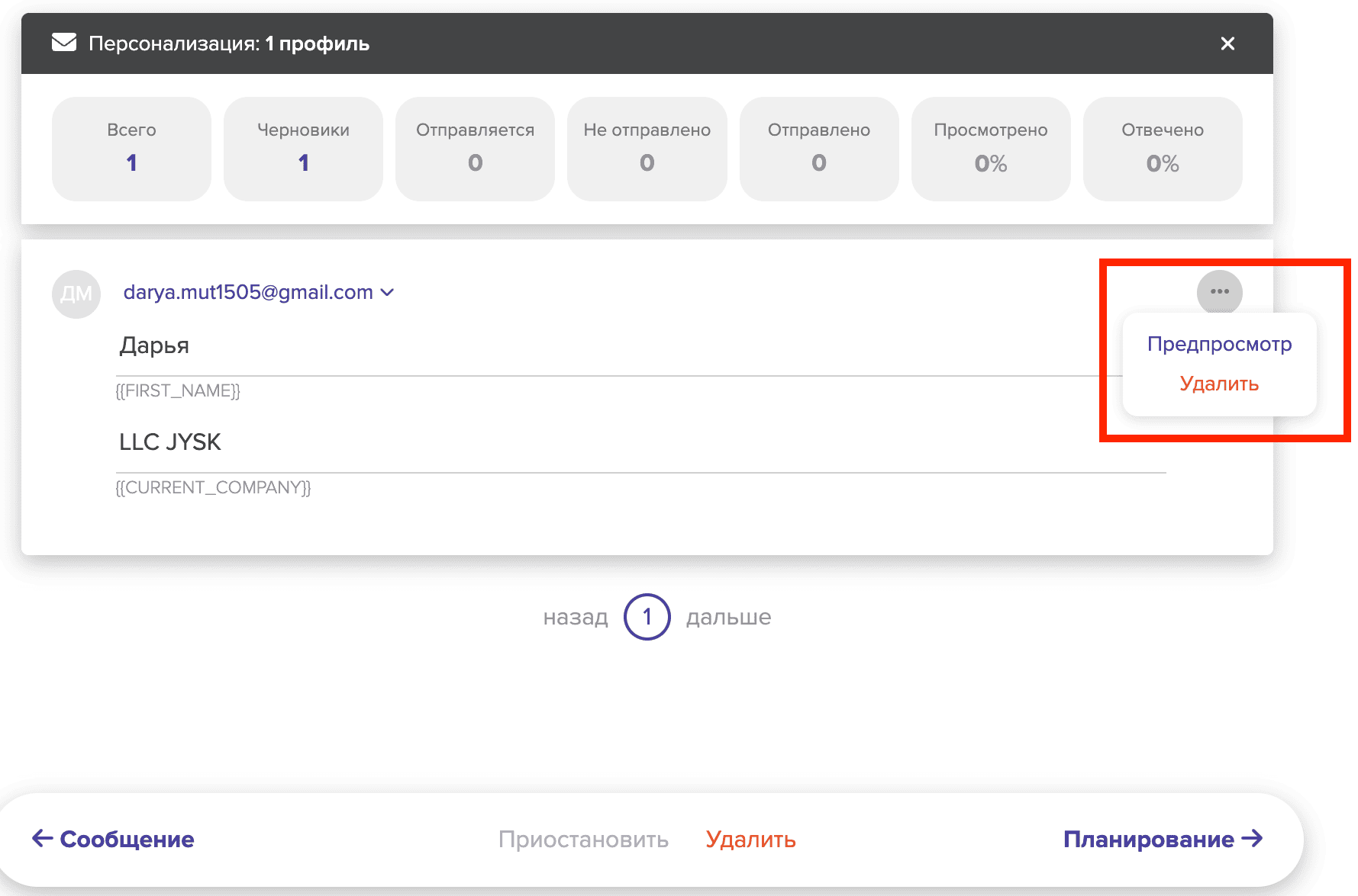 Здесь вы можете выбрать нужный имейл (если в профиле кандидата указано несколько), проверить , как выглядят добавленные вами переменные , посмотреть на сообщения в режиме предпросмотра или удалить отдельных кандидатов из рассылки. Как только вы убедились в том, что все готово, перейдите к этапу "Планирование ".