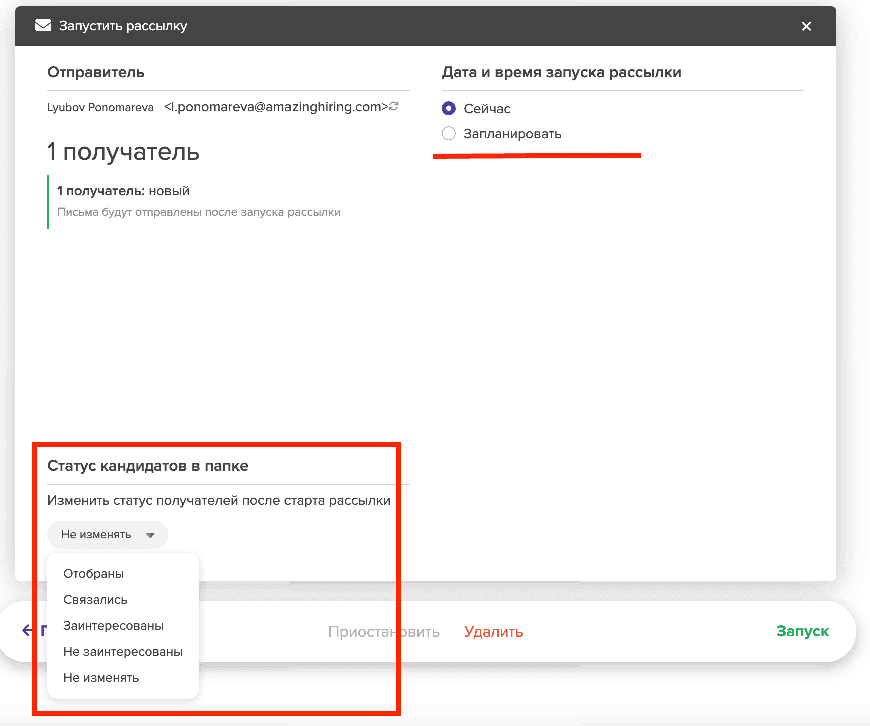 Вы можете отправить вашу рассылку сразу же или настроить отложенную отправку. Также вы можете выбрать статус , который автоматически будет присвоен всем кандидатам, которые были добавлены в рассылку. Осталось сделать последний шаг и нажать "Запуск".